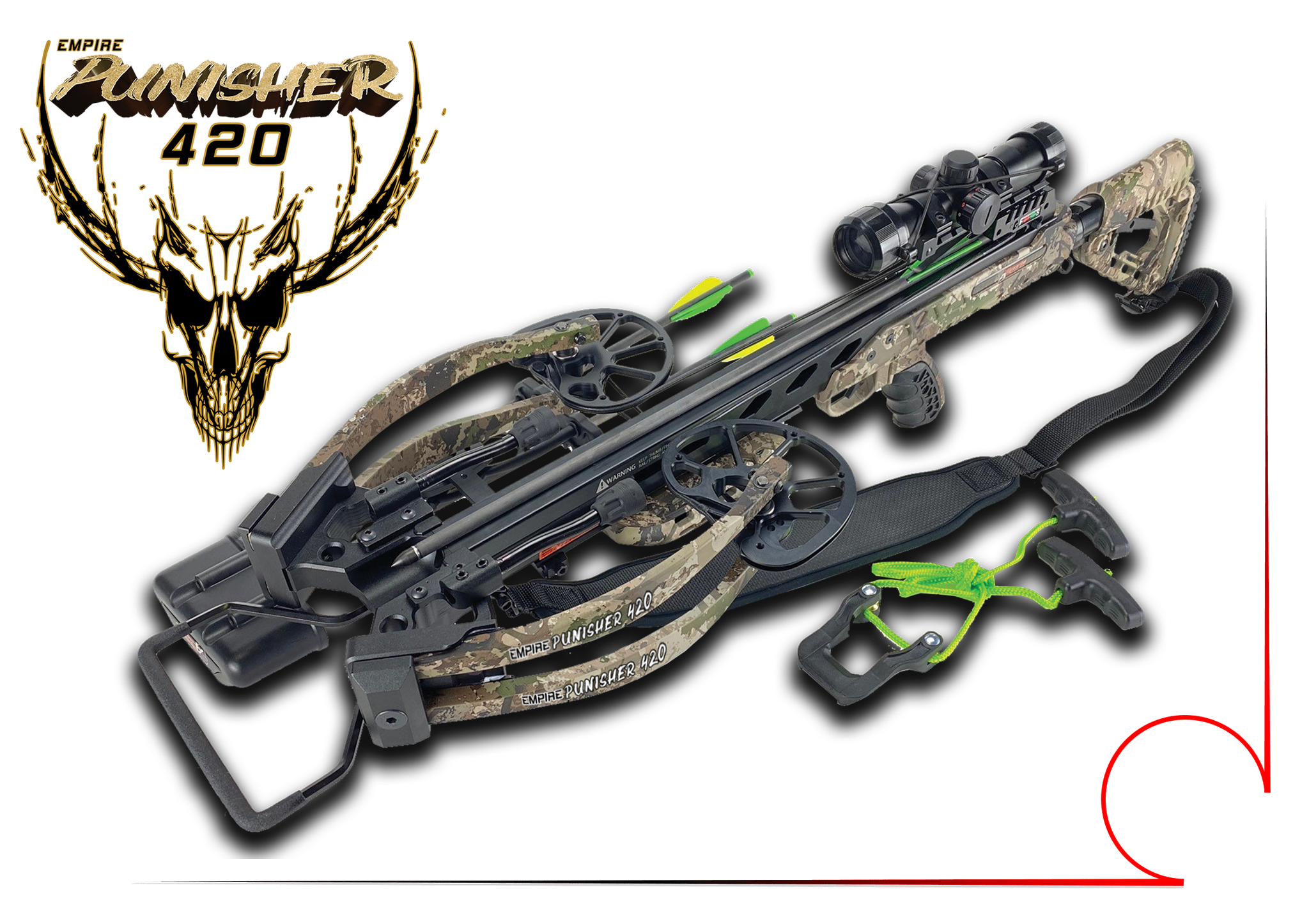 SA Sports new Empire Punisher™ 420 is on the cutting edge of today’s modern crossbow technologies. The Punisher features an ULTRA NARROW profile at only 12 inches un-cocked at rest and a mere 7.75 inches axle to axle when cocked and ready to rock. Features reverse cam design, the Punisher clocks in at 420FPS and produces a punishing 156.5 Ft Lbs of force. Extremely quiet and compact the Punisher™ will easily shoot out to 100 yards while maintaining enough power to do the job. Comes completely equipped to shoot directly out of the box. Includes Illuminated Multi Reticle Scope, Quiver, 3 Carbon Bolts, Special U-Sled Rope Cocker, and Sling.